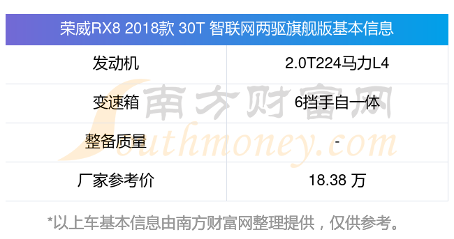 荣威RX8 2018款 30T 智联网两驱旗舰版动力上搭载的是一台2.0T224马力L4涡轮增压发动机,匹配6挡手自一体自动档变速箱,燃料形式为汽油,厂家参考价18.38万元。