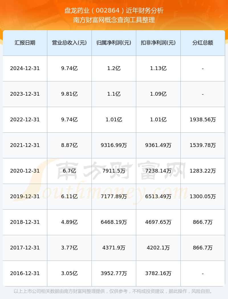 2024年盘龙药业总营收9.74亿,同比增长-0.71%;净利润1.2亿,同比增长8.91%;销售毛利率60.82%。
