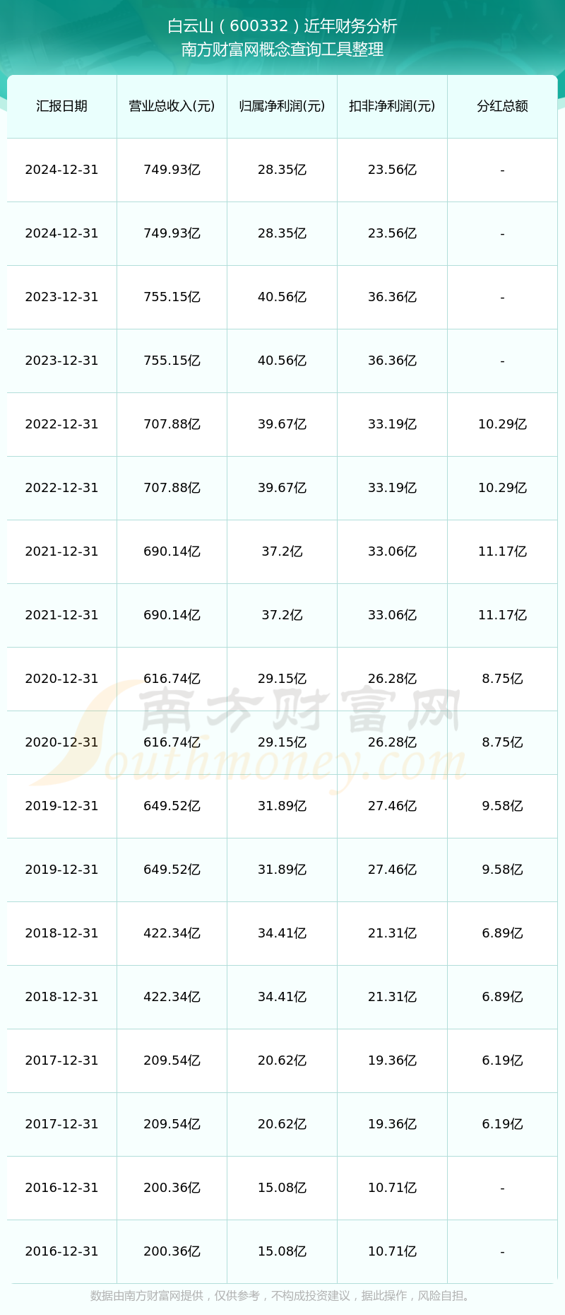 白云山公司2024年实现营业收入749.93亿元,同比增长-0.69%;净利润28.35亿元,同比增长-30.09%;毛利率16.7%。